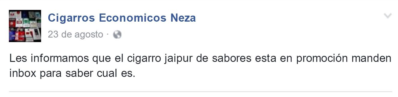 En total trasgresión de la ley, los administradores del perfil publican fotografías de los cigarros que comercializan, de marcas como Jaipur, Police, Patron., Stellar, BlueRiver, Ocean, Texas, Dart, Just Black y Sheriff.