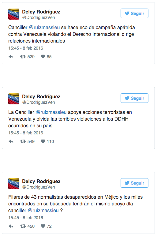Cabe mencionar que, a pesar de que Ruiz Massieu afirmó en más de una ocasión que no se ha recibido ninguna comunicación oficial de parte del gobierno venezolano, la ministra del Poder Popular para Relaciones Exteriores de Venezuela, Delcy Rodríguez, publicó en su cuenta de Twitter que “La Canciller Ruiz Massieu apoya acciones terroristas en Venezuela”, junto con otros mensajes.