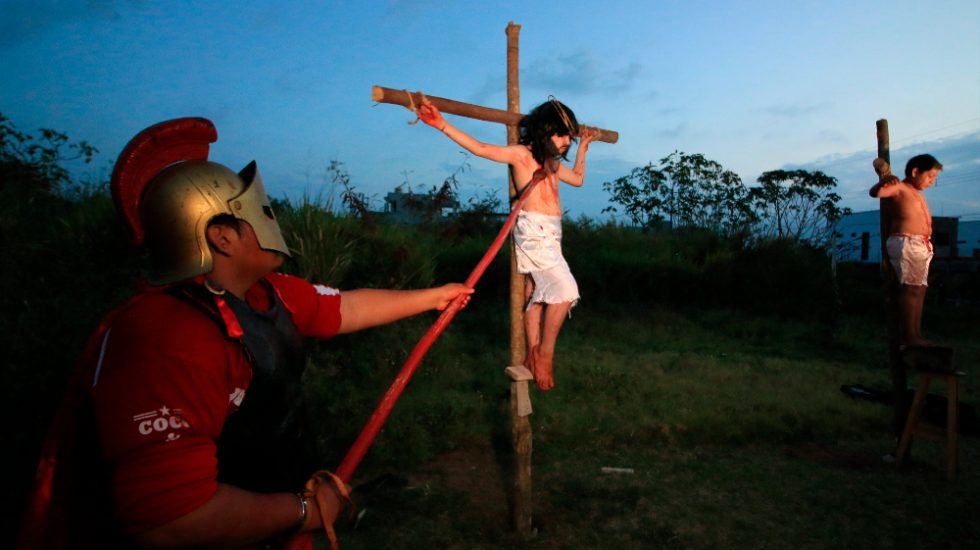 Entre oraciones para que acabe la pandemia y los feminicidios en México, Rodrigo Vidal, de 10 años, representa a Jesús en un viacrucis conformado únicamente por niños en el municipio de Cárdenas, Tabasco.