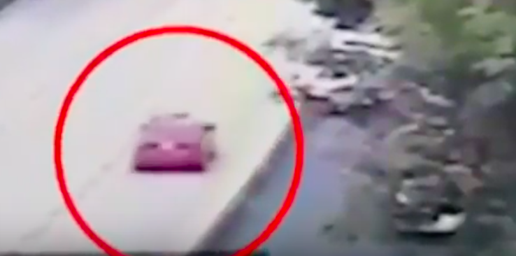 Una cámara de vigilancia instalada en la esquina de Balderas y Ernesto Pugibet captó cómo un Audi de color rojo llevaba consigo a un policía al borde del cofre.