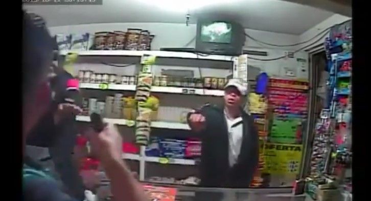 El encargado del local al ver que los delincuentes entran armados a su negocio, saca una pistola y los enfrenta, el dependiente parece haber empezado el intercambio de amenazas pero con el fin de que se fueran los delincuentes.