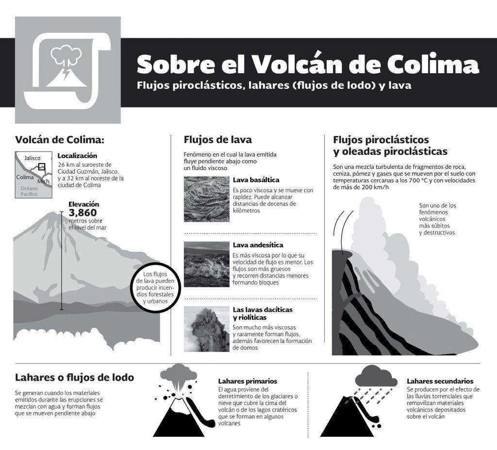 A través de una infografía, el Sistema Nacional de Protección Civil de la Secretaría de Gobernación, explicó que la dispersión de cenizas es la lluvia de material fragmentado, menor a dos milímetros de diámetro, que se produce durante las erupciones explosivas y está controlada por la dirección y velocidad del viento.