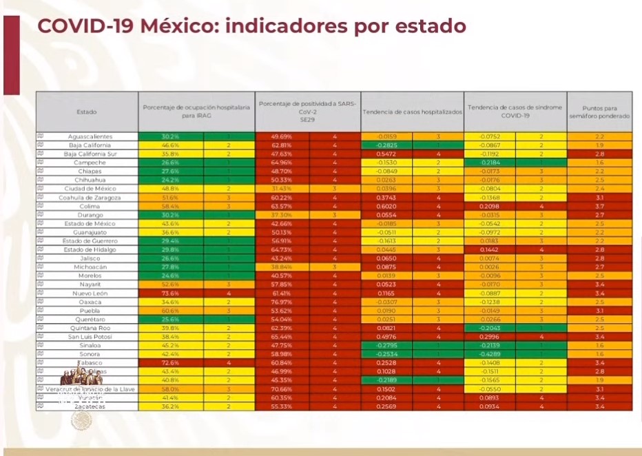 Hugo López-Gatell presentó este viernes el Semáforo de Riesgo Epidemiológico por COVID-19, en el que la mitad del país se encuentra en color rojo de alerta.