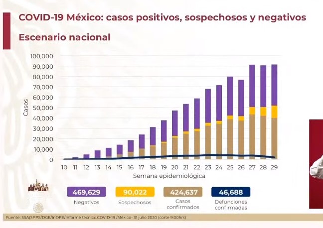 La Secretaría de Salud dio a conocer este viernes que suman 424 mil 637 casos confirmados acumulados de COVID-19 en México, mientras que hay 46 mil 688 muertes por la enfermedad.
