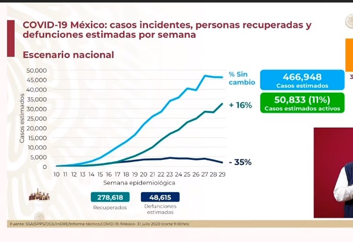 En México se estima que hay 50 mil 833 casos activos de COVID-19, además de que se estima que se han recuperado 278 mil 618 personas de la enfermedad.