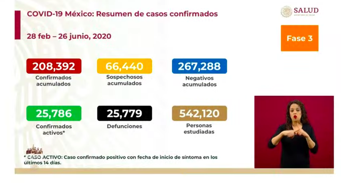 La Secretaría de Salud dio a conocer este viernes que suman 208 mil 392 casos confirmados acumulados de COVID-19 en México, de los cuales 25 mil 786 son activos, mientras que hay 25 mil 779 muertos por la enfermedad.