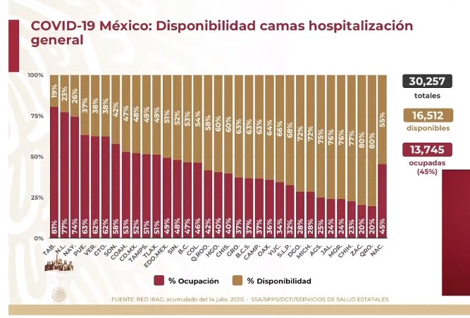 A nivel nacional la ocupación de camas de hospitalización general IRAG (Infección Respiratoria Aguda Grave) es del 45 por ciento, mientras que la de camas con ventilador es del 39 por ciento.