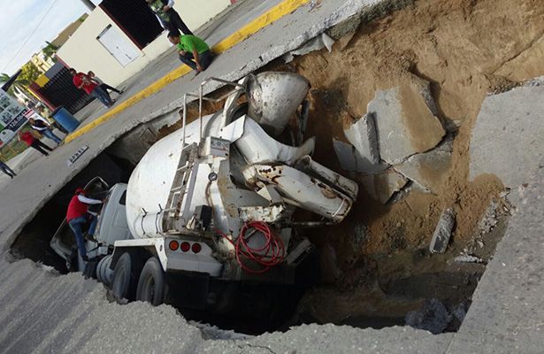 El incidente ocurrió a las 15:10 h del viernes, cuando el camión que transportaba mezcla de cemento se hundió en la Calle 10, en la colonia Jardín 20 de Noviembre, en Ciudad Madero.