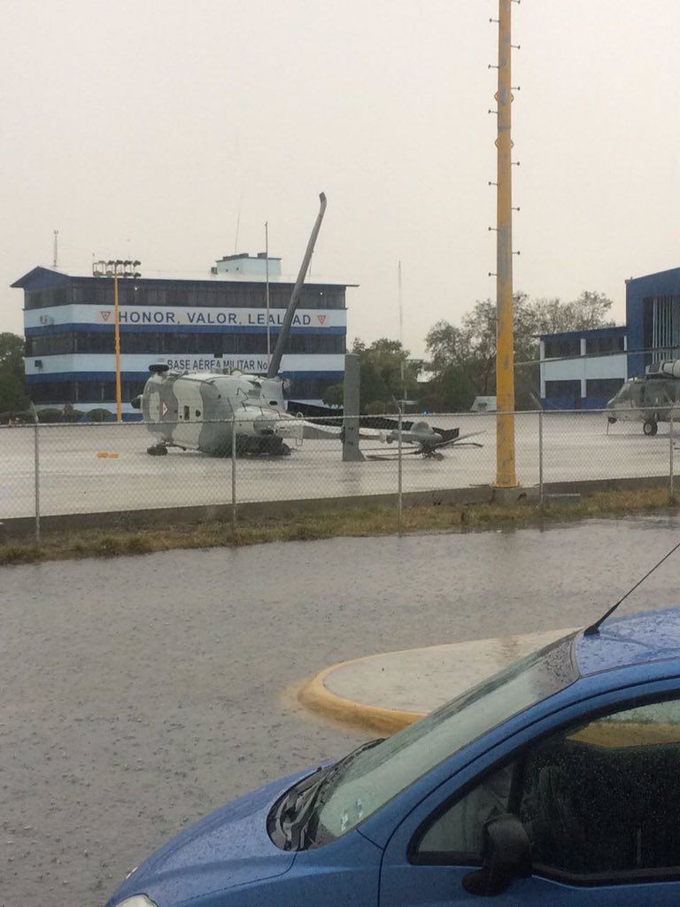 También un helicóptero de la Base Aérea Militar terminó volcado. Pese a los daños materiales, las corporaciones de auxilio no reportan personas lesionadas.