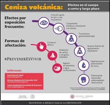 En caso de caída de ceniza, se recomendó a la población usar cubrebocas, tapar tinacos y depósitos de agua; quitar continuamente las cenizas para evitar que se acumulen en techos ligeros y de las coladeras para que no se tape el drenaje.