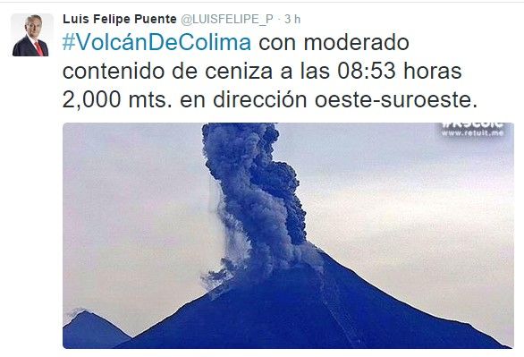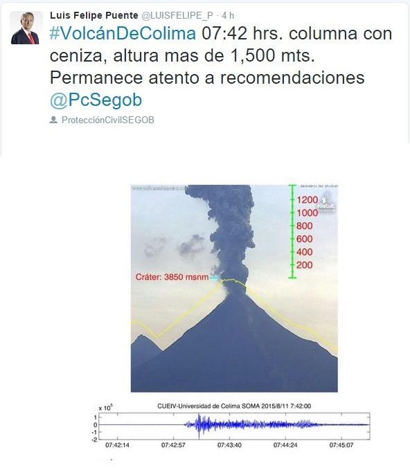 “#VolcánDeColima 07:42 hrs. columna con ceniza, altura más de 1,500 mts. Permanece atento a recomendaciones @PcSegob”, escribió en la red social.