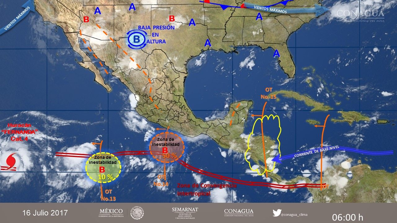 En el reporte más reciente, señaló que también la onda tropical 14 y una zona de inestabilidad con potencial ciclónico al sur de las costas de Colima y Michoacán, una nueva onda tropical sobre la Península de Yucatán y la zona de inestabilidad que permanecerá en el norte del país, originarán potencial de lluvias.