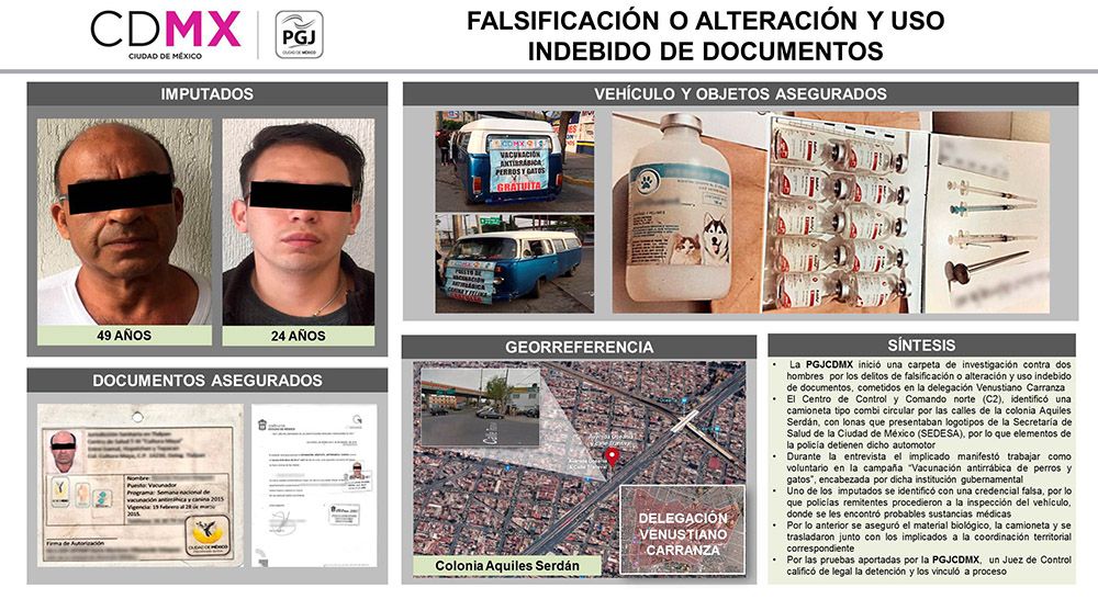 Luego de que la Procuraduría General de Justicia (PGJ) de la Ciudad de México presentó los datos de prueba que acusan a los dos hombres, de 49 y 24 años, utilizar documentos falsos para montar una supuesta campaña de vacunación para animales domésticos en dicha demarcación, el Juez de Control calificó como legal la detención y los vinculó a proceso.