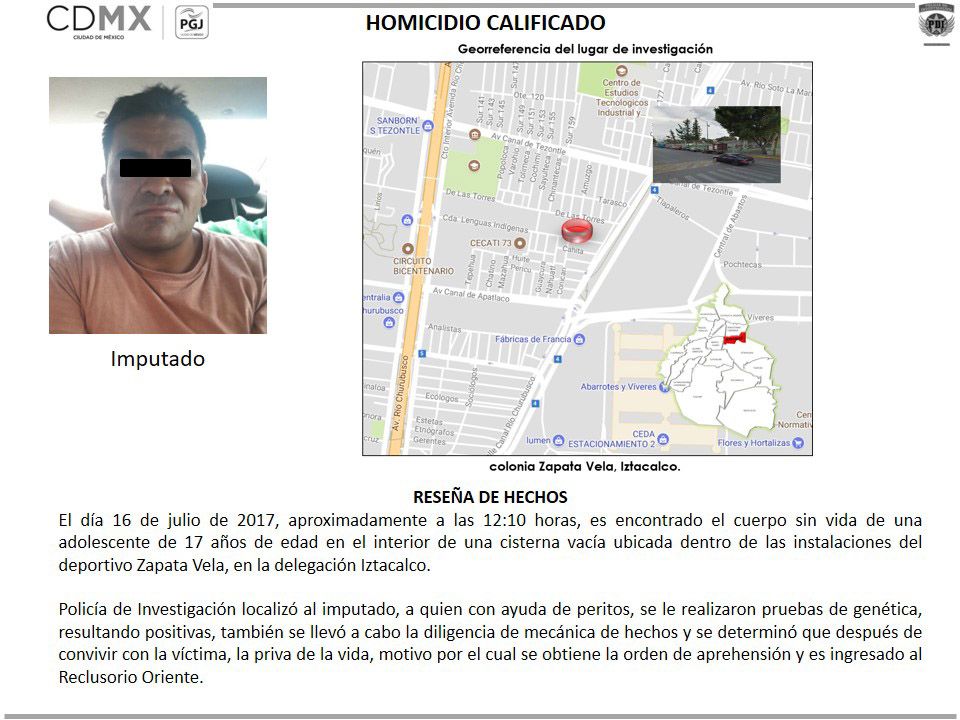 De acuerdo con la Procuraduría General de Justicia (PGJ) capitalina, los hechos se registraron el pasado 16 de junio en la colonia Carlos Zapata de la delegación Iztacalco, cuando el indiciado y la ofendida se encontraban en la cisterna vacía, lugar donde se presume que la adolescente recibió los golpes que presentaba su cuerpo.