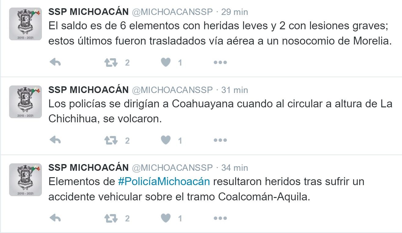 Los dos lesionados que se reportan en estado grave fueron trasladados vía aérea a un nosocomio de Morelia para recibir la atención médica correspondiente. El resto de los elementos fueron trasladados en ambulancia a un hospital de Coalcomán para su pronta atención médica.