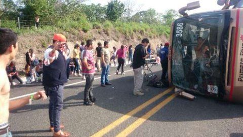 Un autobús de la línea Pimer Plus, presuntamente con estudiantes, volcó en el kilómetro 274 de la Autopista Siglo XXI.