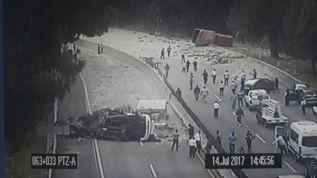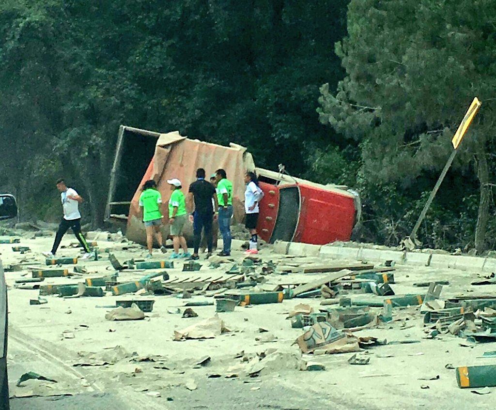 El accidente sucedió en el kilómetro 63 en dirección a Cuernavaca, a la altura de Tres Marías. Además del camión que transportaba cemento, un vehículo pesado resultó volcado en dirección contraria.