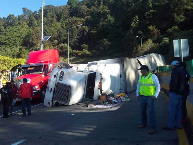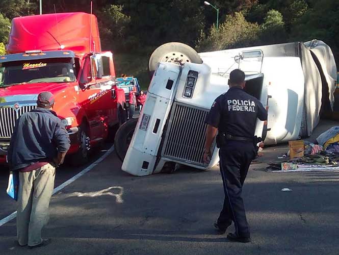 La mañana del día de hoy, aproximadamente a las 8:00 h, un tráiler que tenía llantas lisas y circulaba a exceso de velocidad volcó en la autopista México-Cuernavaca a la altura del kilómetro 66+500 en dirección de norte a sur.