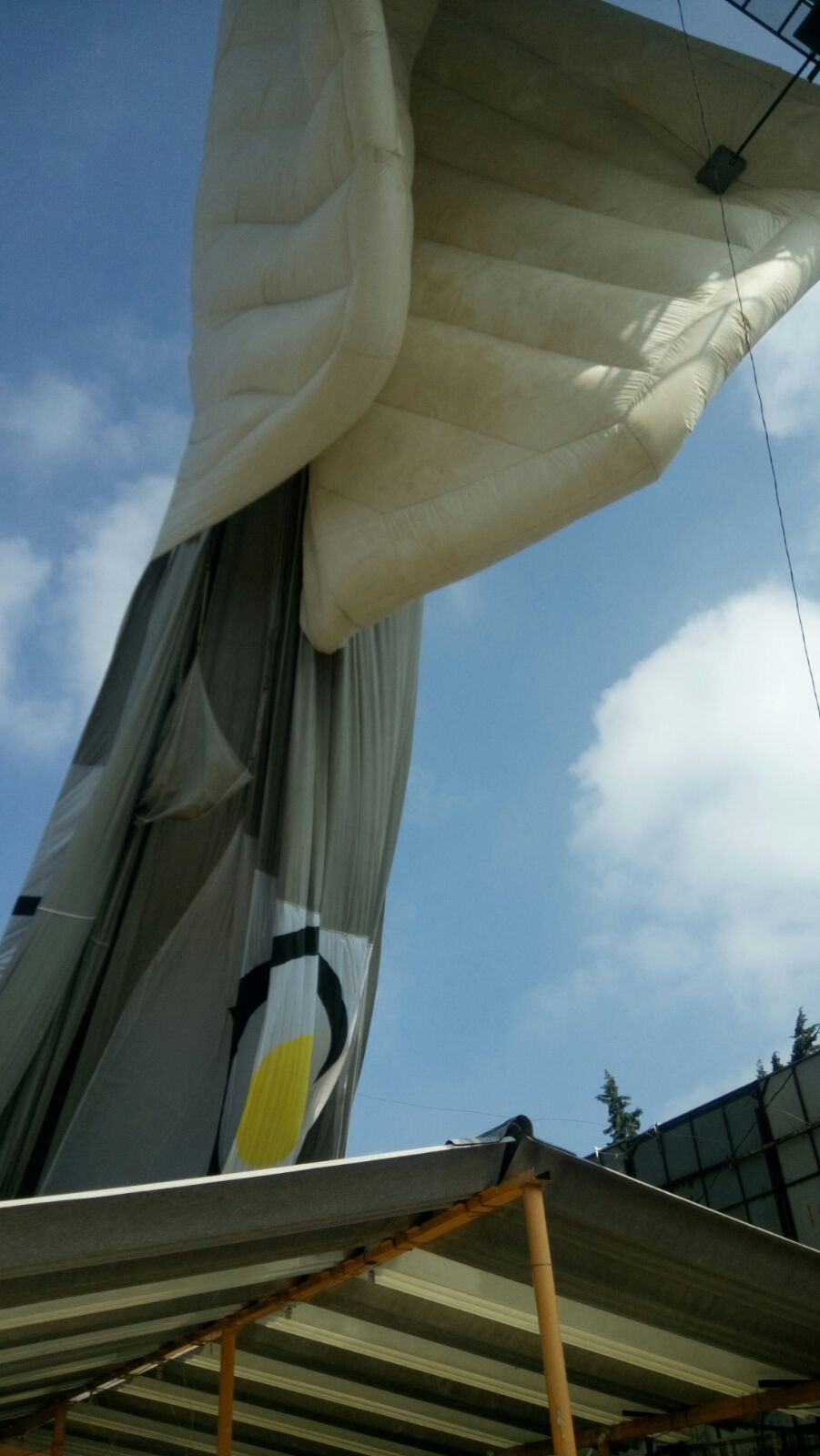 Sin embargo al momento del despegue a causa de la falla de uno de los motores y por la fuerza del viento, el dirigible fue desviado hasta un espectacular, dentro del campo, donde la parte trasera se atoró. Posteriormente el zepelín se impactó sobre el techo de lámina de las instalaciones del complejo de Lomas Verdes.