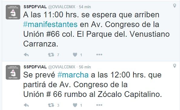 En su cuenta de Twitter @OVIALCDMX, indicó que al mediodía, se prevé una marcha que partirá de Cámara de Diputados con rumbo hacia la Plaza de la Constitución.