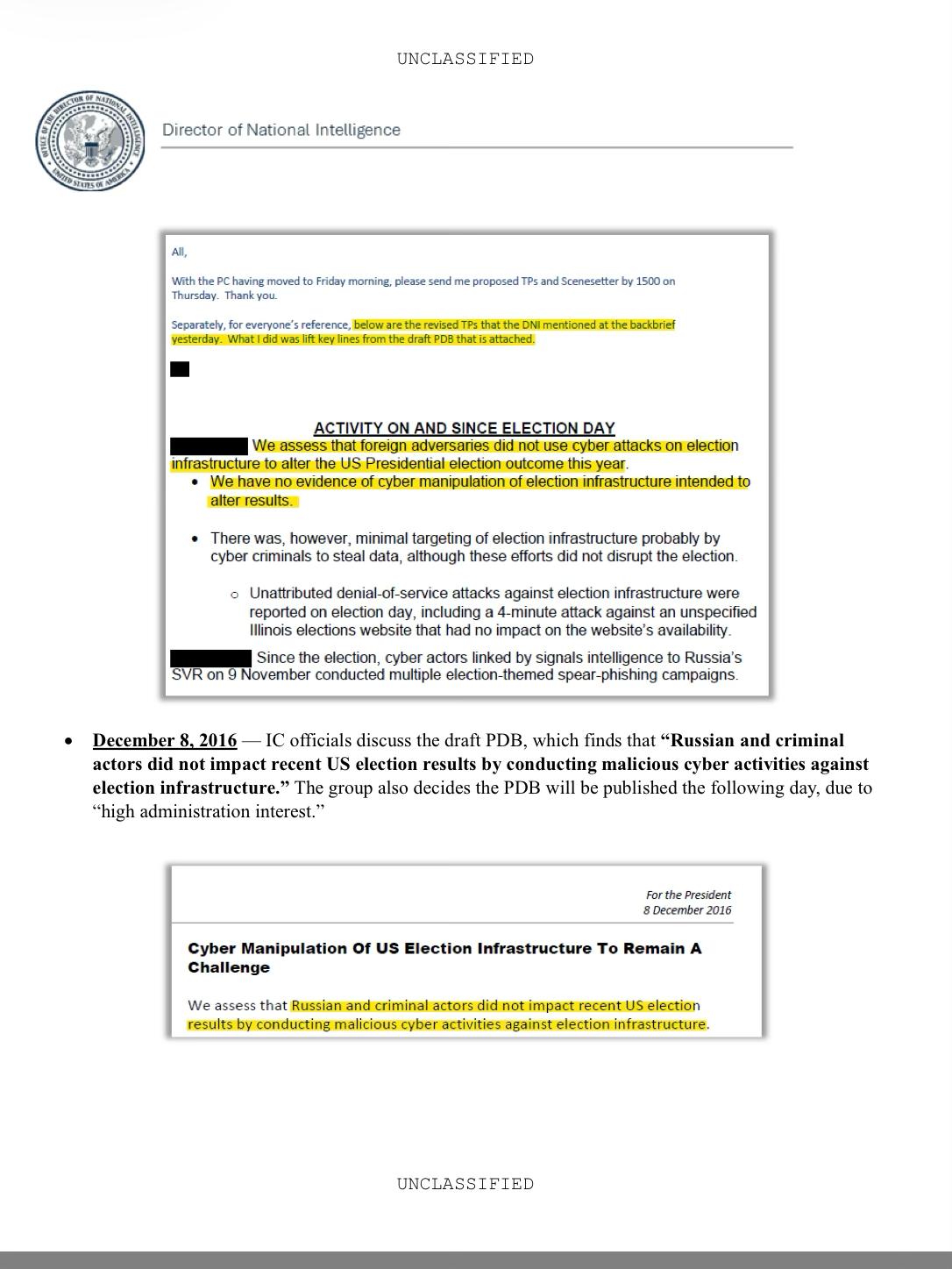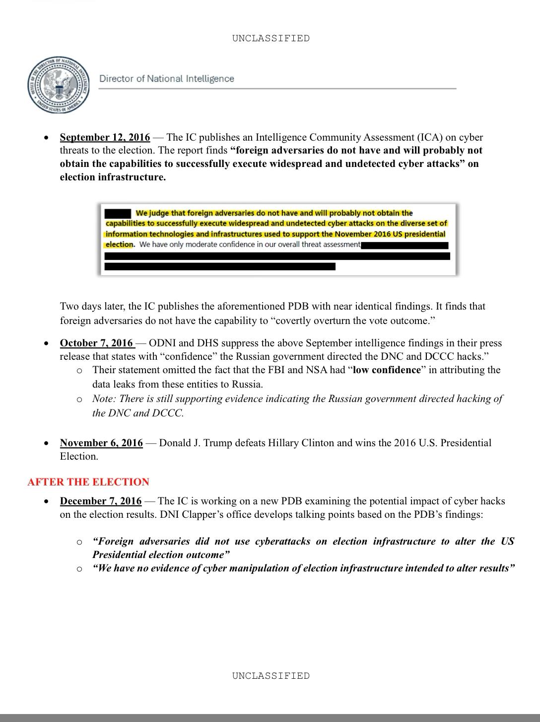 El documento contradice el contenido de 4 reportes de la Dirección Nacional de Inteligencia, el Senado de Estados Unidos, el Departamento de Justicia y el Centro de Seguridad Cibernética y Anti Terrorismo y el del Fiscal Especial Robert Mueller, que Trump impidió se difundiera al público.