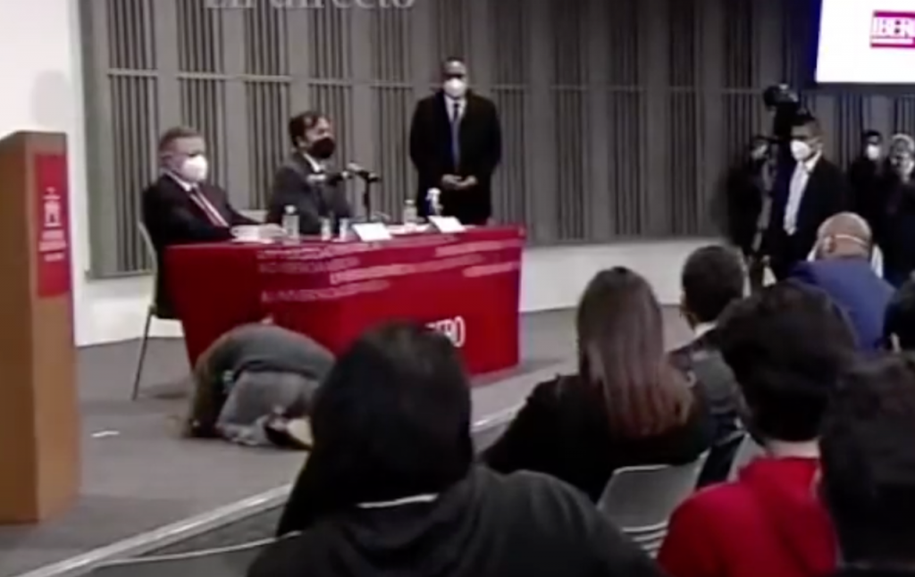 Es justo un minuto lo que dura Alejandra cercana a la mesa principal de la conferencia y hablándole al ministro, tiempo suficiente para que le hablara de pie, de rodillas y recargada sobre la mesa y después hincada por completo a su lado.