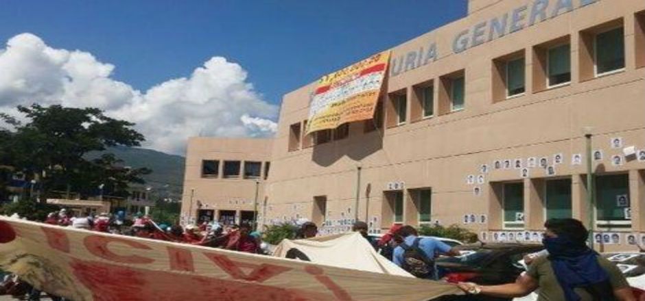 Compañeros y familiares de los 43 normalistas de Ayotzinapa se manifiestan en la explanada de la Procuraduría General de Justicia (PGJ) de Guerrero en demanda de la aparición con vida de los jóvenes. Los manifestantes, quienes en su mayoría tienen el rostro cubierto, están colocando imágenes de los desaparecidos y mantas en las que se … Continued