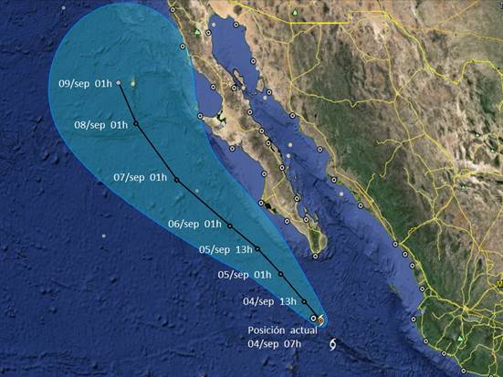 El ciclón, de categoría 1, se localiza aproximadamente a 245 kilómetros al sur-suroeste de Cabo San Lucas, Baja California Sur, y a 225 kilómetros al norte de Isla Socorro, Colima. Presenta vientos máximos sostenidos de 150 km/h, rachas de hasta 170 km/h y desplazamiento hacia el noroeste a 11 km/h.