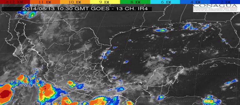 Para la Mesa Central seguirá cielo medio nublado a nublado, 80 por ciento de posibilidad de lluvias fuertes con actividad eléctricas y granizadas en Nayarit, Jalisco, Colima y Michoacán.