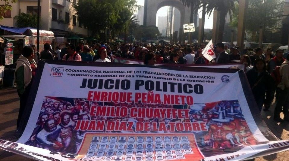 La marcha la encabezan integrantes de la Sección 22 de Oaxaca, quienes portan una manta con los rostros de los 43 normalistas y en la que se pide el juicio político a los funcionarios mencionados.