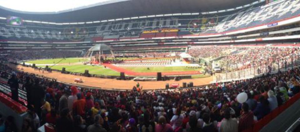 El ambiente en el llamado “Coloso de Santa Úrsula”, donde se ha montado un escenario en la parte central con flores blancas y fotografías de “Chespirito”, se percibe positivo. La gente canta temas como “Qué bonita vecindad”, lanza porras y hace la tradicional ola humana.
