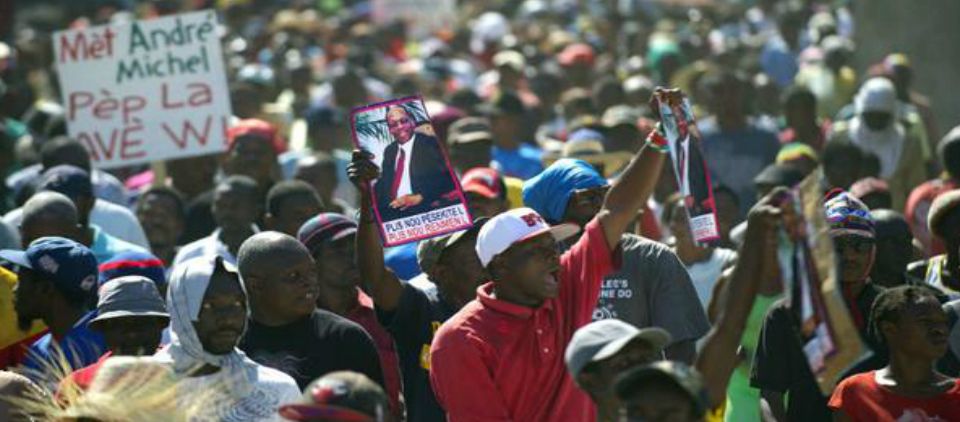 Muchos manifestantes portaron carteles con leyendas que exigían la renuncia del presidente Michel Martelly y el primer ministro Laurent Lamothe.