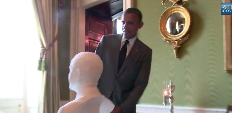 La mejor parte del video, sin embargo, puede ser cuando Obama se encuentra con su busto, inquietantemente realista, por primera vez.