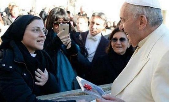 La monja y cantante italiana sor Cristina Scuccia finalmente conoció a Francisco el miércoles durante su audiencia general. Le entregó una copia de su primer CD, que incluye una versión del éxito de Madonna.