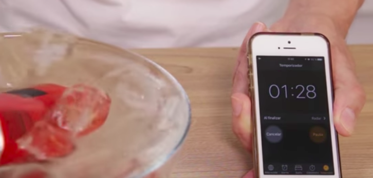 Primero, toma un tazón grande y coloca muchos hielos y agua. Después de eso, añade tres cucharadas grandes de sal y espera un minuto y medio para agregar un poco más de sal y revolver. Ahora, solo tendrás que esperar otro minuto y medio más.