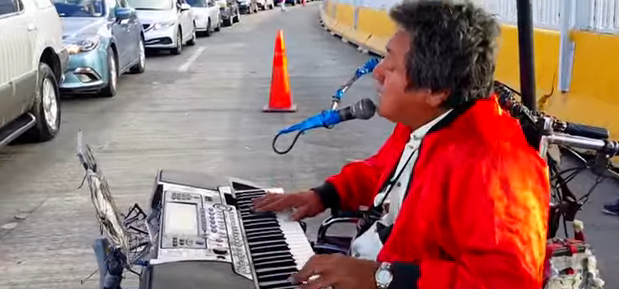 Su discapacidad física no ha sido obstáculo para que Daniel Robles Barraza, con ingenio, salga adelante y se gane la vida trabajando tocando el teclado y cantando para deleitar a su público en la línea internacional de Tijuana.