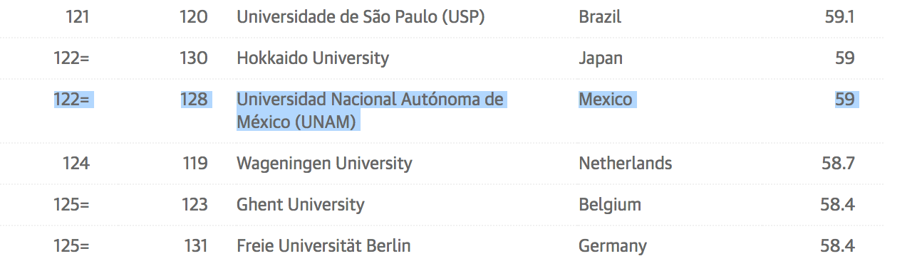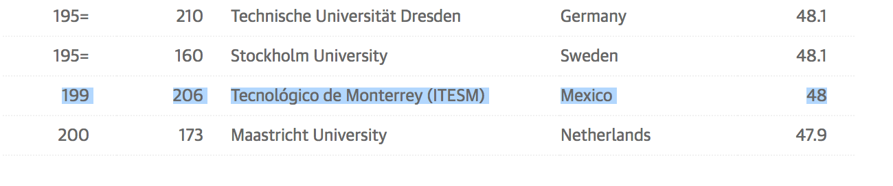 - México sitúa a dos de sus instituciones en el top 200 por primera vez en la historia de nuestro ranking: Tecnológico de Monterrey en el puesto 199 y la Universidad Nacional Autónoma de México en el 122.