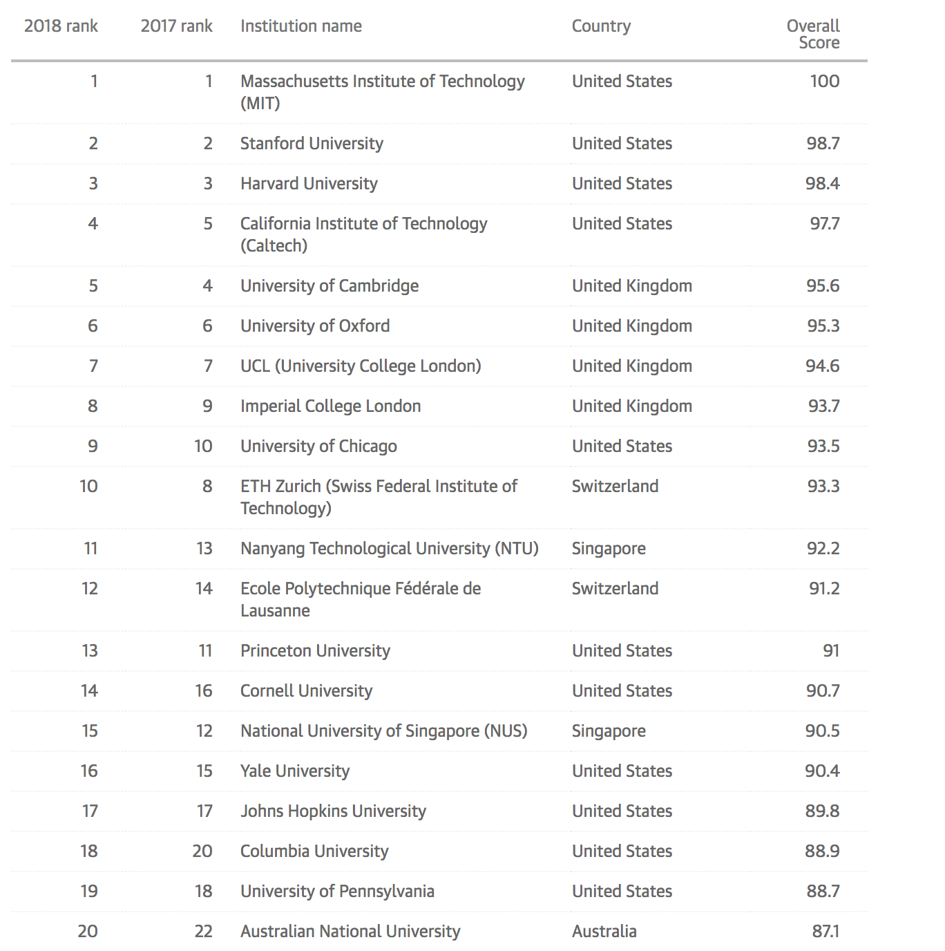 Ben Sowter, Director de Investigación de QS, mencionó al respecto que la institución “MIT es el núcleo de un ecosistema de innovación sin rival. El conjunto de las empresas creadas por sus ex-alumnos junto con ingresos de 2 trillones de dólares, lo convierte en el equivalente a la 11º economía más grande del mundo”.