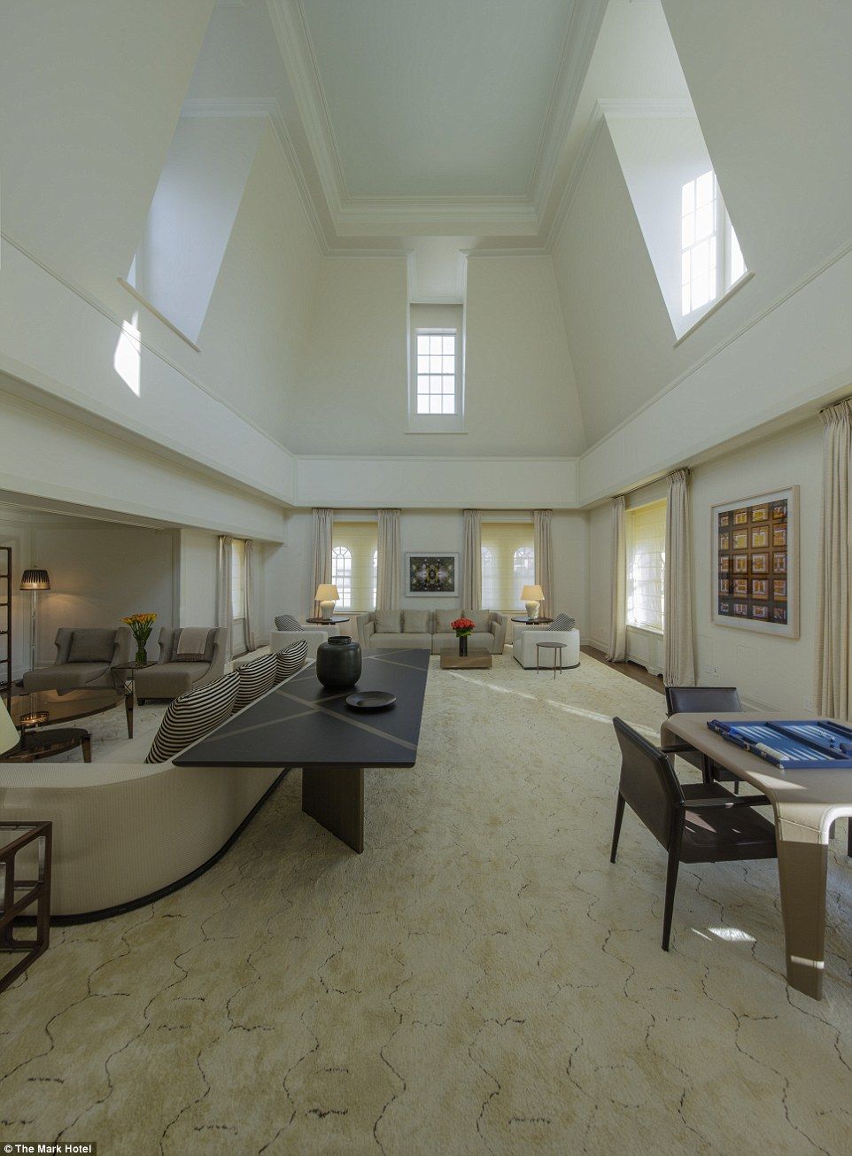 La sala principal tiene un techo de casi 8 metros de altura y en la mesa del comedor entran 24 comensales. El hotel 5 estrellas está en la calle 77, entre la 5ta Avenida y Madison. La zona es la más lujosa de la ciudad, repleta de tiendas de diseño y galerías.
