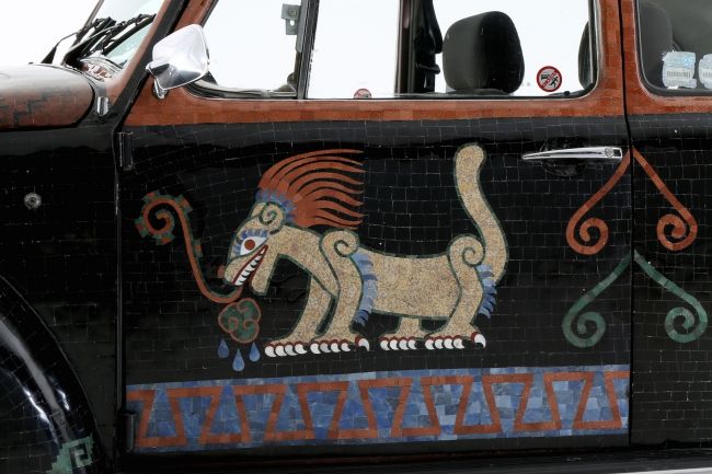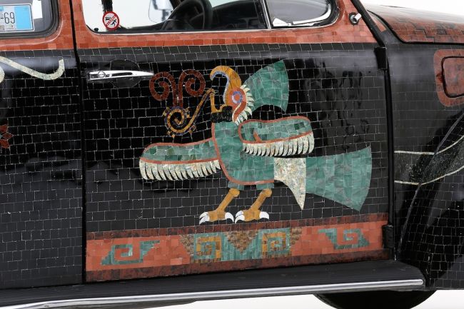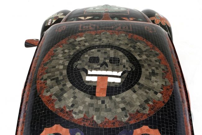 El automóvil fue decorado en San Martin de las Pirámides, en el central Estado de México, donde se encuentra la zona arqueológica de Teotihuacán.