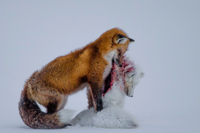 Ambos animales se caracterizan por cazar animales pequeños, sin embargo el zorro rojo también es depredador de su pariente blanco, el cual es más pequeño. Por lo que en la foto se aprecia como el ejemplar rojo recoge el cadáver del zorro del Ártico que mató para después comerlo.