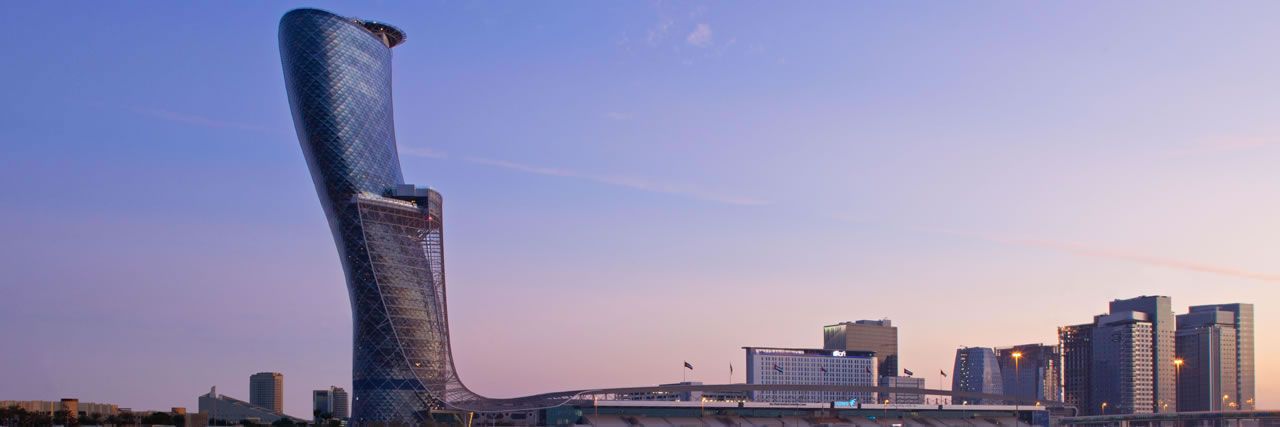 Capital Gate, una torre de 165 metros de altura, es el espacio de un gran conjunto de oficinas, de un maravilloso centro de negocios (denominado “Abu Dhabi National Exhibition Centre”) y también sede del hotel de cinco estrellas Capital Gate Hyatt, con 189 habitaciones y suites situadas entre las plantas 18 y 33 del edificio.