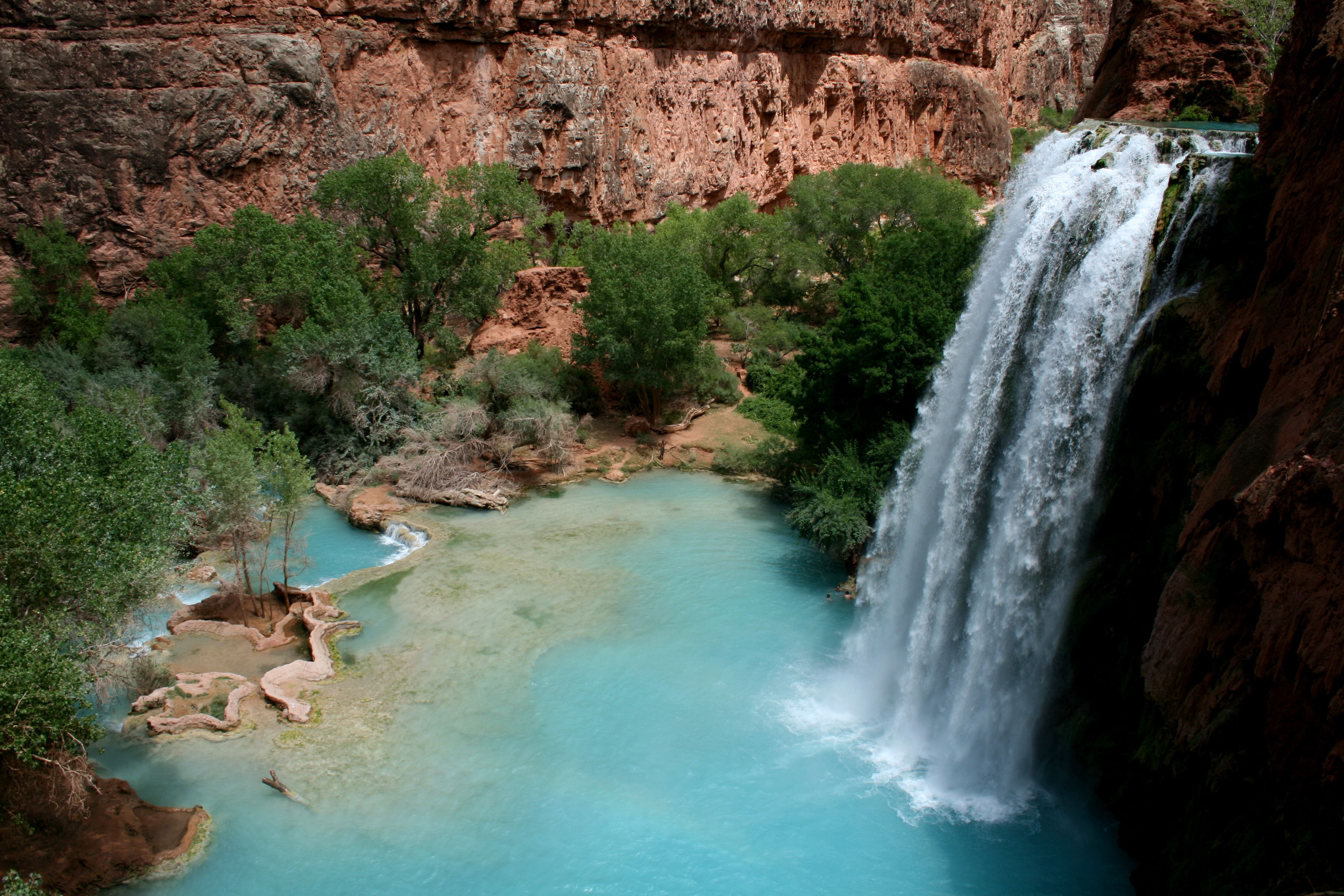 Havasu se sitúa al sur del Parque Nacional del Gran Cañón del Colorado, en Arizona, en territorio de los indios Havasupai. El agua cae a caño, desde una altura de 37 metros, a una piscina natural color turquesa que contrasta con las rocas rojizas que la circundan. Las paredes que rodean la cascada amplifican su estruendo, que puede oírse a un kilómetro de distancia.