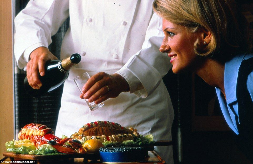 Porque las imágenes muestran a los alegres comensales bebiendo vino y champaña (al mismo tiempo), mientras ven cómo los sobrecargos, acompañados por un chef, cortan una pierna, preparan una ensalada completa, o sirviéndoles una deliciosa langosta.