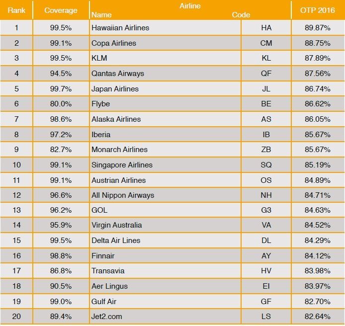 Hawaiian Airlines fue la aerolínea más puntual del mundo en 2016, quien tuvo un desempeño de puntualidad (OTP, por sus siglas en inglés) de 89.87 por ciento, esto de acuerdo al informe ‘Punctuality League 2016‘ de la empresa de análisis de viajes aéreos OAG.