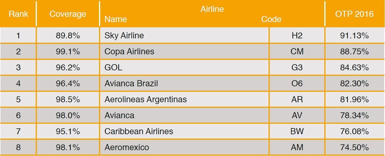 Copa Airlines ocupa el segundo lugar, con un 88.75 por ciento de puntualidad. Gol, la aerolínea más grande de la región en términos de cantidad de vuelos en 2016, ocupa el tercer puesto con una puntualidad del 84.63 por ciento.