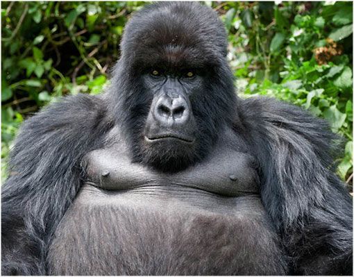 Gorila de Montaña. Es la especie más conocida de gorilas, pero que es amenazado por el contagio de enfermedades humanas, así como la caza.