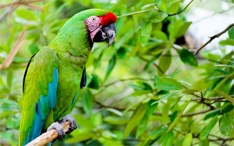Guacamaya verde o militar. Amenazada por el comercio ilegal de animales, así como la destrucción de su hábitat.