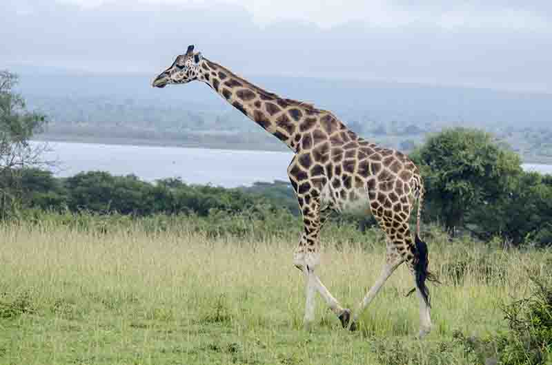 Jirafa de Uganda. Muy atractiva para la caza pues su piel es distinta en coloración a la de las otras jirafas, además de tener cinco cuernos.