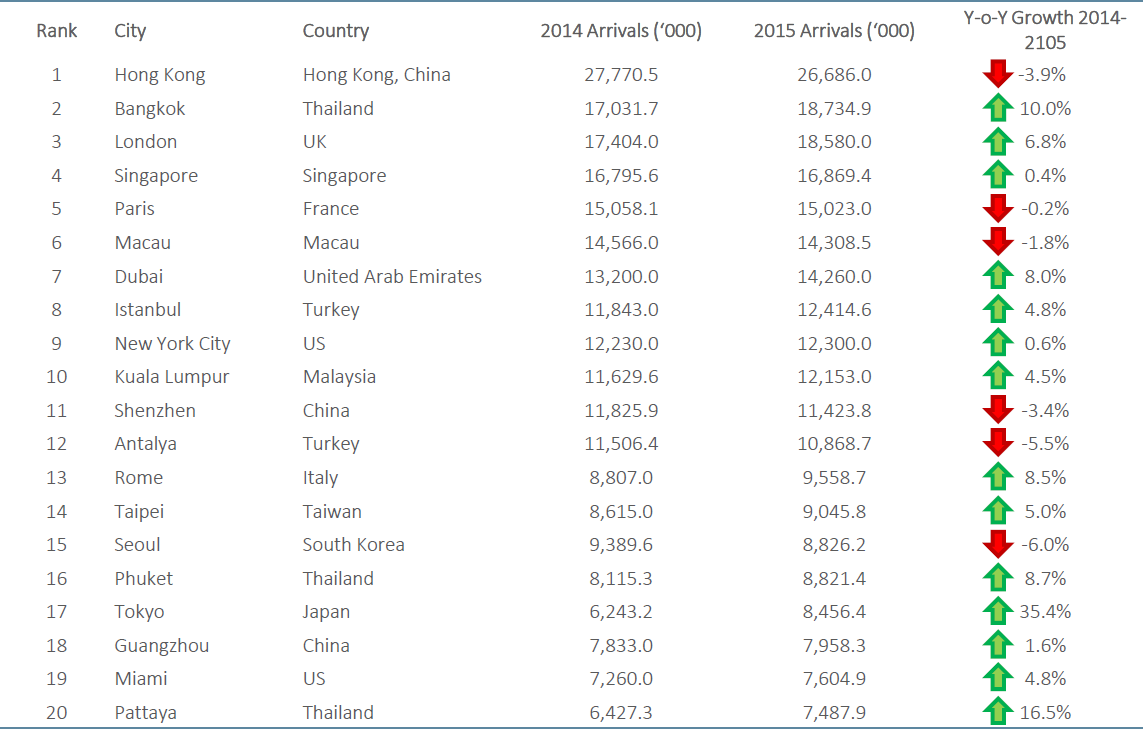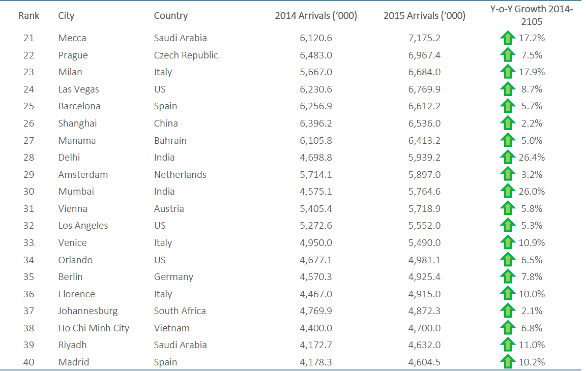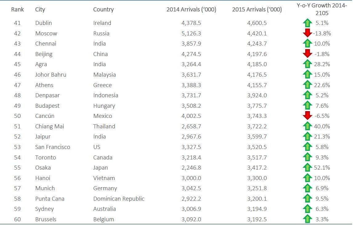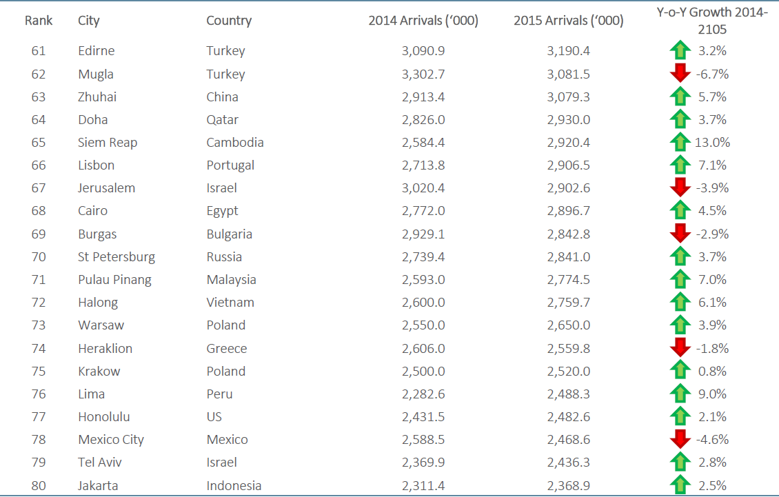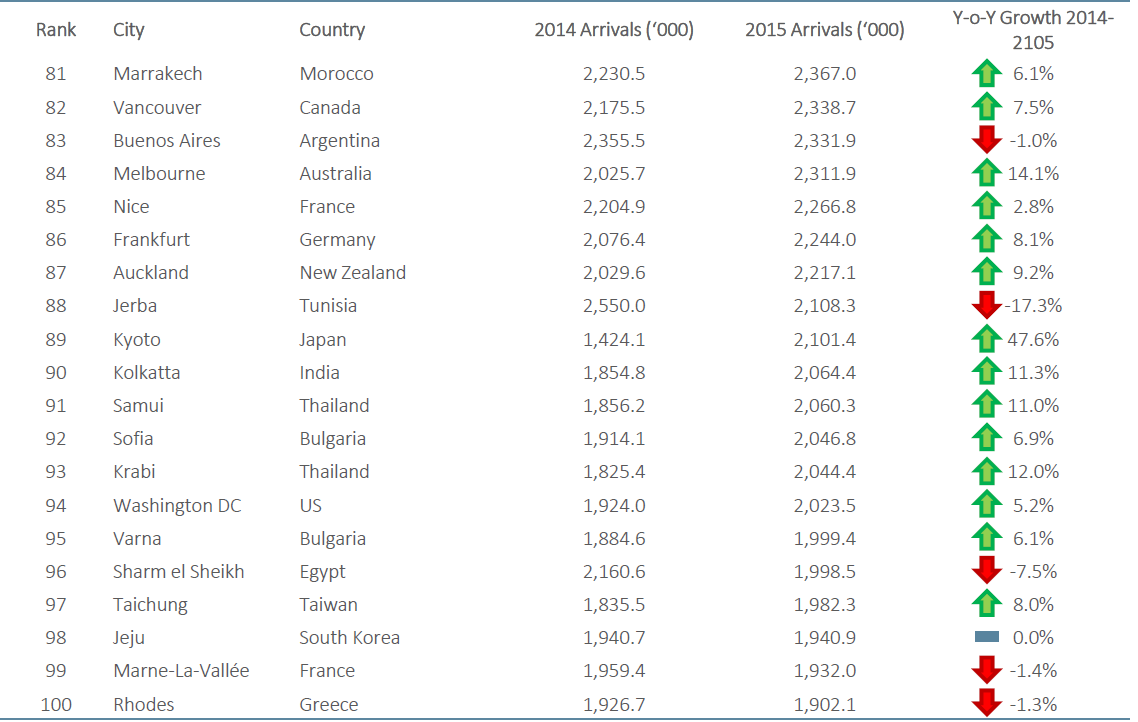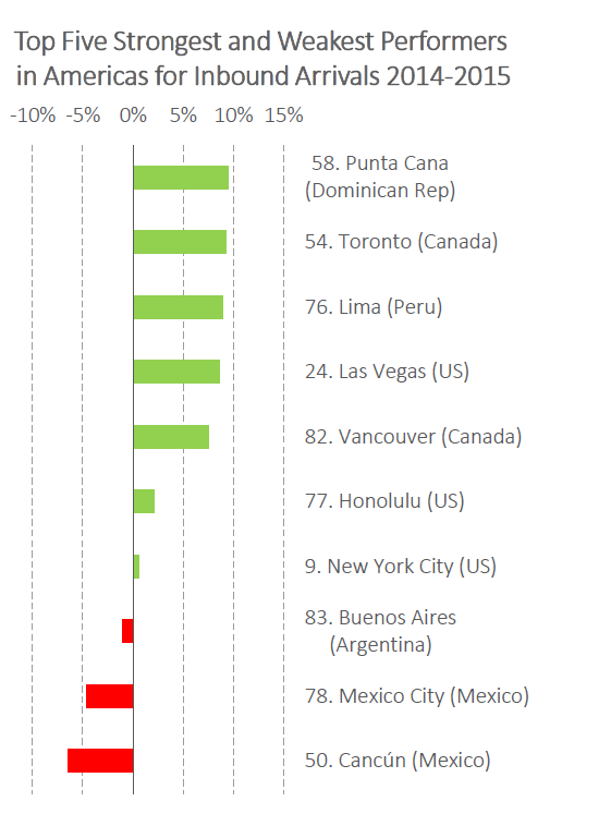 Su reporte indica que si bien 2015 fue otro año turbulento a nivel mundial, con ataques terroristas, conflictos geopolíticos, incertidumbre económica y problemas de salud incluyendo MERS (Síndrome respiratorio por coronavirus de Oriente Medio) y Zika, mismas que afectaron las decisiones de los turistas, los cien principales destinos urbanos registraron un crecimiento del 55 por ciento con respecto a datos del 2014.
